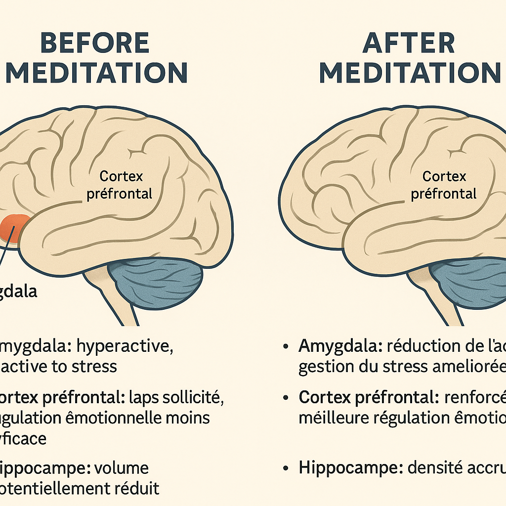 Quand une émotion intense surgit, c’est l’amygdale (la région du cerveau qui gère les réponses émotionnelles) qui appuie sur le bouton panique. La méditation, par la régularité de sa pratique, renforce le cortex préfrontal, cette partie qui analyse, calme, relativise.